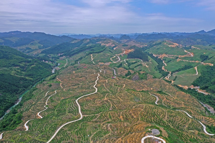 Aerial photo taken on May 23, 2020 shows a panoramic view of an orange plantation in Huanjiang Maonan Autonomous County, south China's Guangxi Zhuang Autonomous Region. (Xinhua/Zhou Hua)