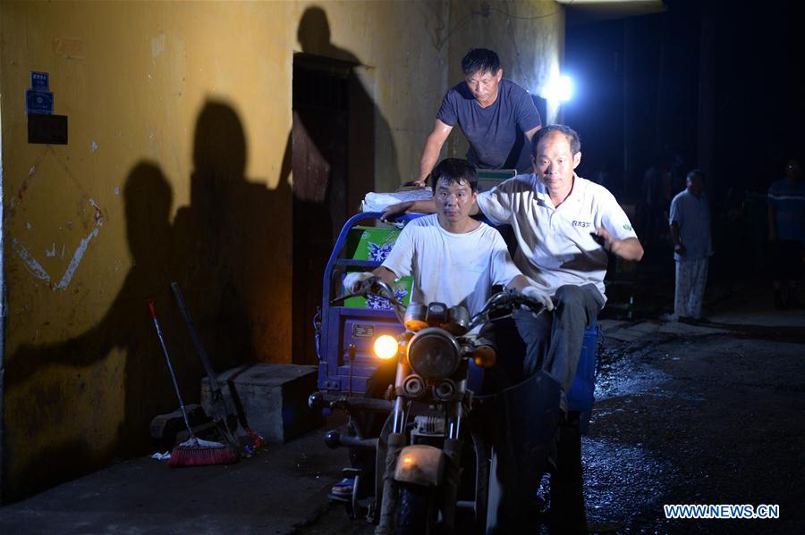 Villagers transfer family belongings during an emergency evacuation in Gaotai Township which lies within the Mengwa Flood Detention Area in Funan County, east China's Anhui Province, July 19, 2020. Hydrological authorities have issued a red alert for floods in the Huaihe River drainage area on Monday. An emergency evacuation was organized between late Sunday and early Monday for residents in the Mengwa Flood Detention Area to prepare against upcoming floods. (Xinhua/Huang Bohan)