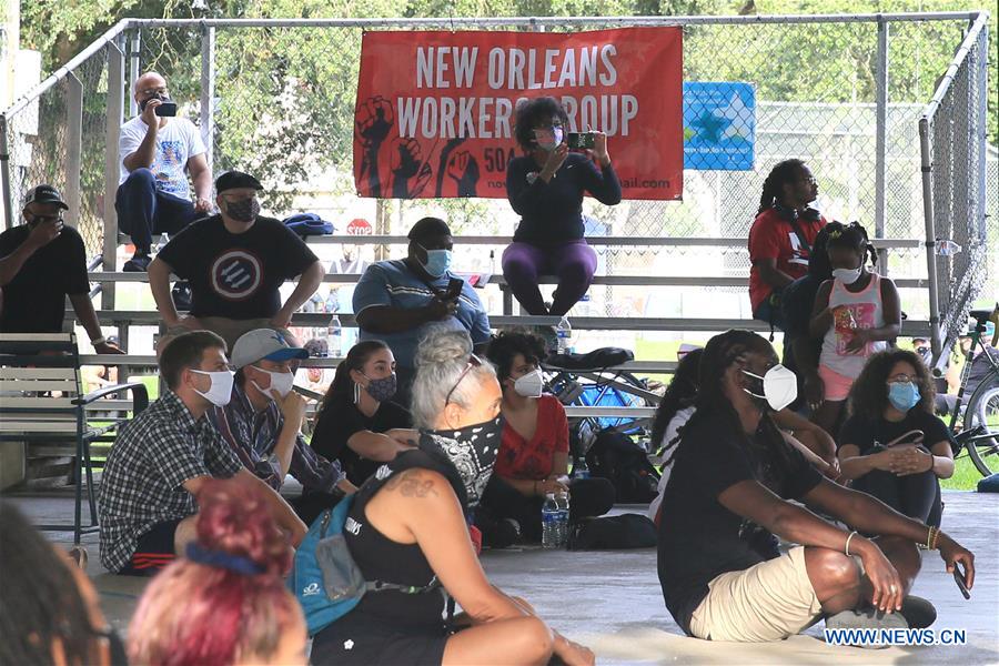 An organizer delivers a speech during a Teachers and Essential Workers Protest in New Orleans, Louisiana, the United States on July 25, 2020. The protesters demanded safe working conditions, extension of unemployment compensation, raise of living wage and universal healthcare amid the COVID-19 pandemic. (Photo by Lan Wei/Xinhua)