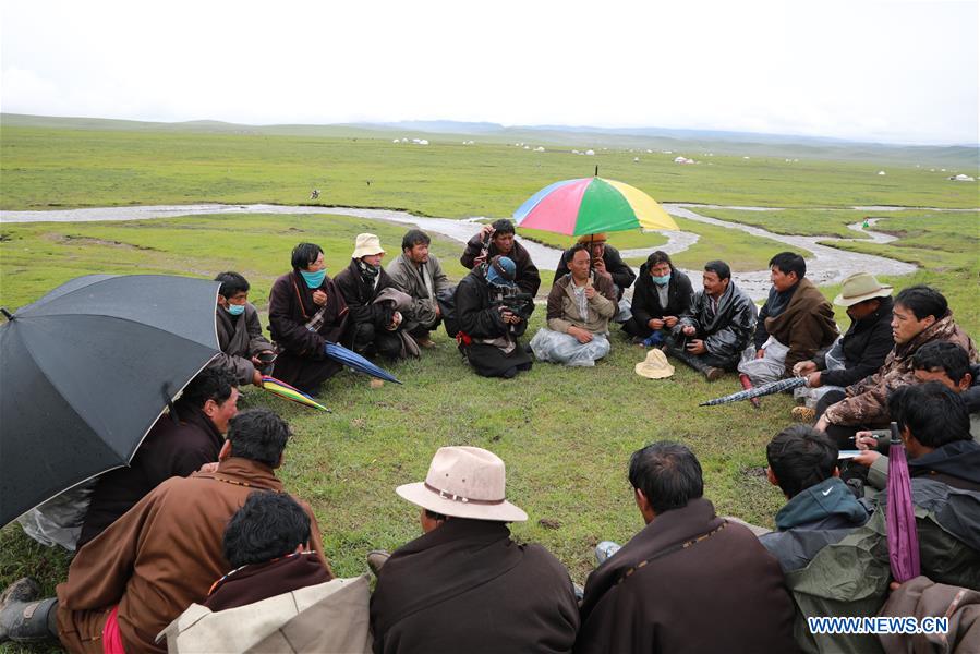 Local herdsmen draw lots to decide who should enter the pasture Qianyangya first in Koce Township of Gannan Tibetan Autonomous Prefecture, northwest China's Gansu Province, July 25, 2020. Since the 1980s, the pasture in Koce Township has been used as an area to reunite lost and found livestock with their owners. Once a year, local herdsmen gather here for one day to bring the livestock they have found while herding and look for their lost ones by identifying the body marks on cattle or sheep. The livestock can be brought home when their ownership is confirmed by most attendees. So far, over 20,000 lost and found livestock have returned to their owners. (Xinhua/Du Zheyu)