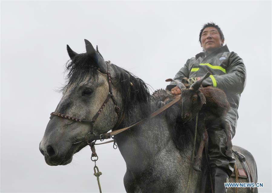 A local herdsman brings a lamb to the pasture Qianyangya in Koce Township of Gannan Tibetan Autonomous Prefecture, northwest China's Gansu Province, July 25, 2020. Since the 1980s, the pasture in Koce Township has been used as an area to reunite lost and found livestock with their owners. Once a year, local herdsmen gather here for one day to bring the livestock they have found while herding and look for their lost ones by identifying the body marks on cattle or sheep. The livestock can be brought home when their ownership is confirmed by most attendees. So far, over 20,000 lost and found livestock have returned to their owners. (Xinhua/Du Zheyu)