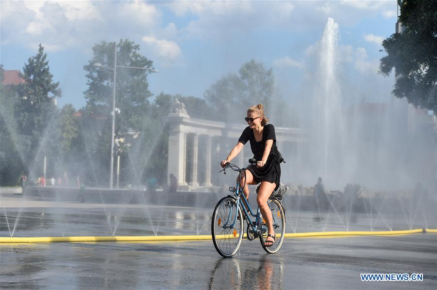 A cyclist passes a water spray on Schwarzenbergplatz in Vienna, Austria, on July 28, 2020. The highest temperature in Vienna reached 37.2 degrees Celsius on Tuesday. (Xinhua/Guo Chen)