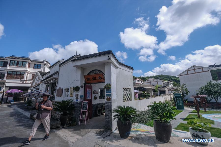 A tourist walks out of an agritainment facility in Xinjian Village of Ganlan Township, Dinghai District, Zhoushan, east China's Zhejiang Province, Aug. 3, 2020. In recent years, the Dinghai District authorities have devoted all-round efforts to improve sanitation and tourist appeal in its rural areas. Statistics show that villages under Dinghai District have received 1.73 million visitor trips in 2019, earning 2.431 billion yuan (348 million U.S. dollars) in tourism revenue. (Xinhua/Xu Yu)