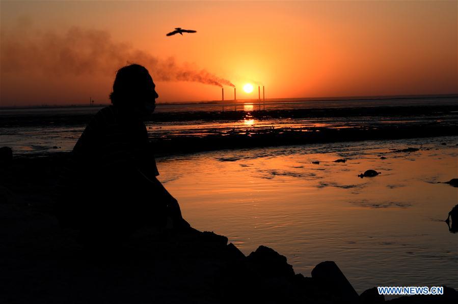 A local resident sits on the beach during sunset in Kuwait City, Kuwait, Aug. 4, 2020. (Photo by Ghazy Qaffaf/Xinhua)