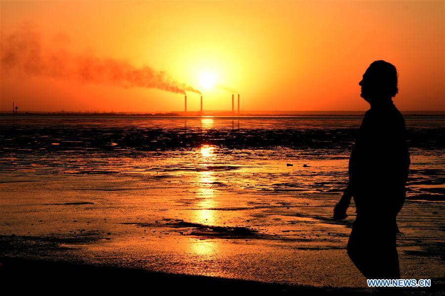 A local resident walks on the beach during sunset in Kuwait City, Kuwait, Aug. 4, 2020. (Photo by Ghazy Qaffaf/Xinhua)