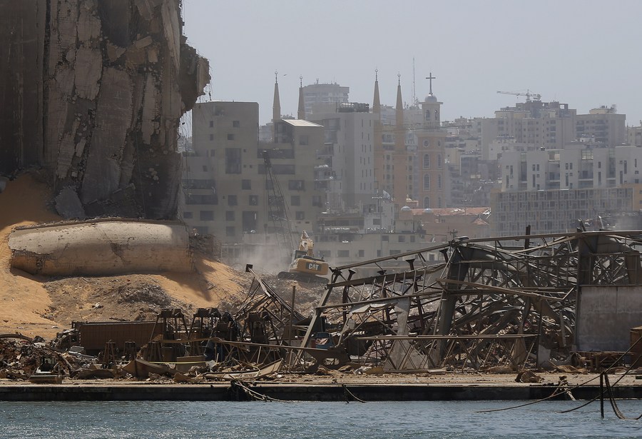 Damaged buildings are seen at the Port of Beirut in Lebanon, Aug. 8, 2020. The Lebanese Health Ministry announced on Saturday that 158 people died and 6,000 were wounded by the huge explosions that hit Beirut's port on Tuesday. (Xinhua/Bilal Jawich)
