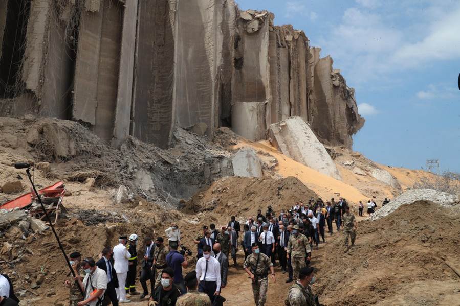 French President Emmanuel Macron visits the Port of Beirut in Beirut, Lebanon, Aug. 6, 2020. (Dalati & Nohra/Handout via Xinhua)
