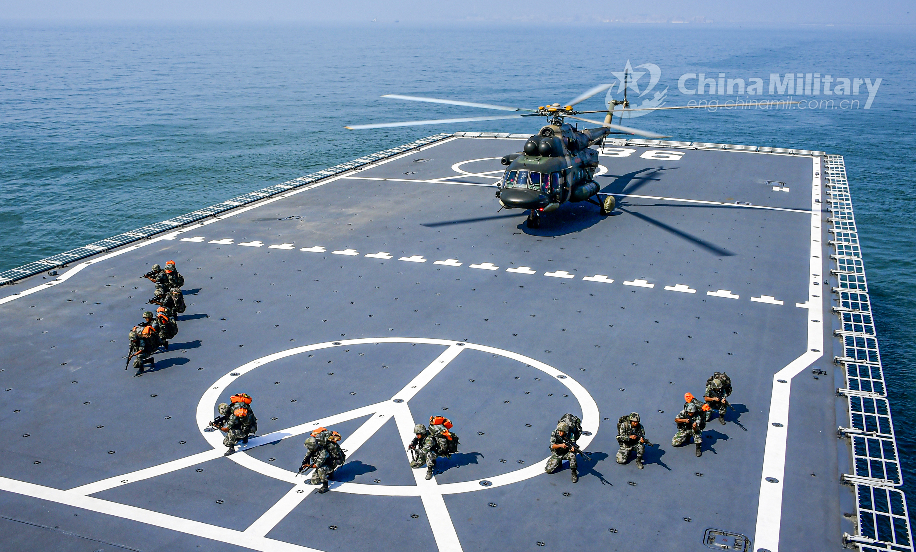 PLA Army soldiers rush to form into a combat readiness formation on the flight deck of the dock landing ship Yimengshan (Hull 988) after stepping off a transport helicopter during an inter-Services maritime coordinated training exercise with the PLA Navy at an undisclosed sea area on August 3, 2020. They are assigned to an army aviation brigade under the PLA 73rd Group Army. (eng.chinamil.com.cn/Photo by Li Shilong)