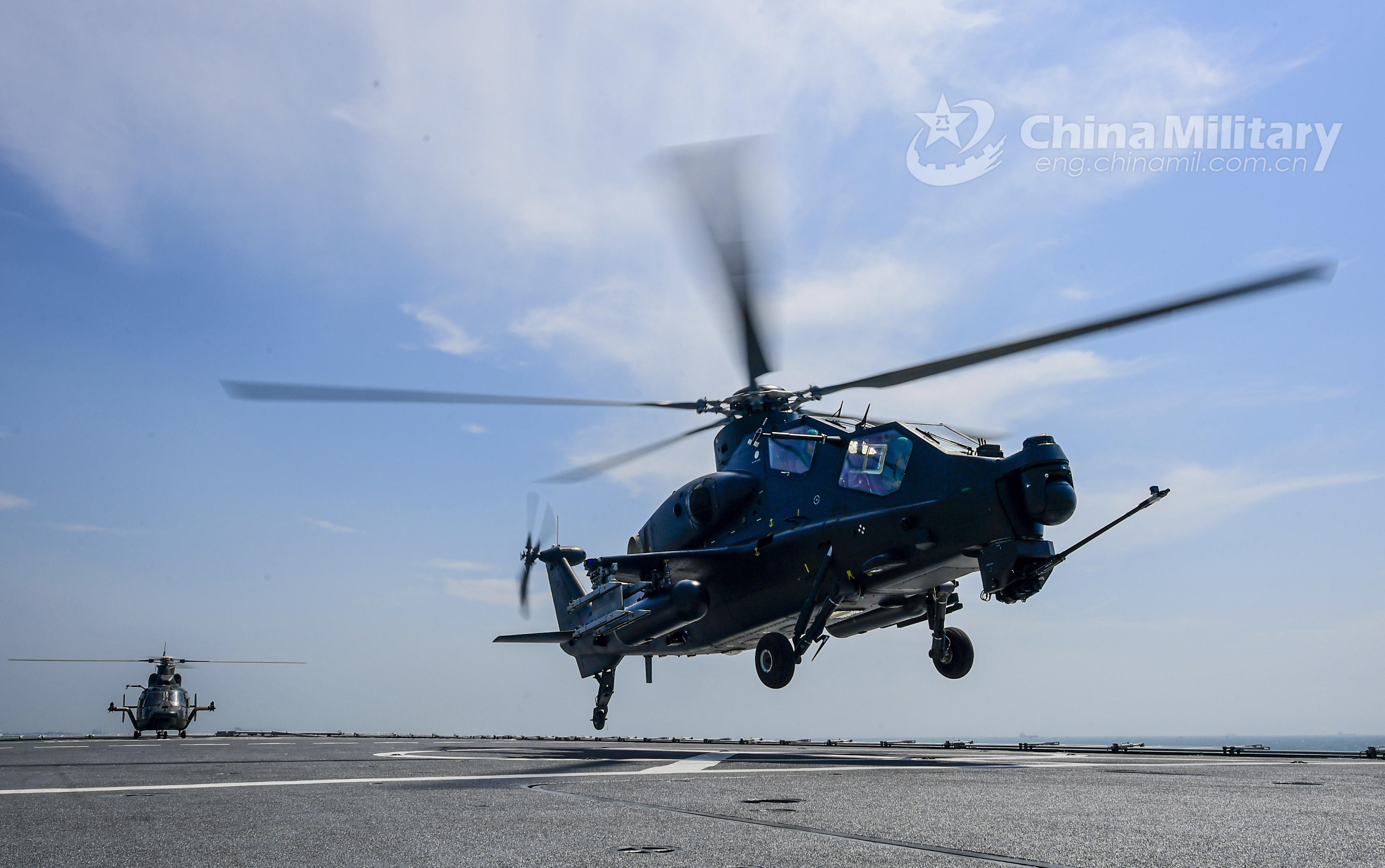 A WZ-10 attack helicopter assigned to an army aviation brigade under the PLA 73rd Group Army lifts off from the flight deck of the dock landing ship Yimengshan (Hull 988) during an inter-Services maritime coordinated training exercise with the PLA Navy at an undisclosed sea area on August 3, 2020. (eng.chinamil.com.cn/Photo by Li Shilong)