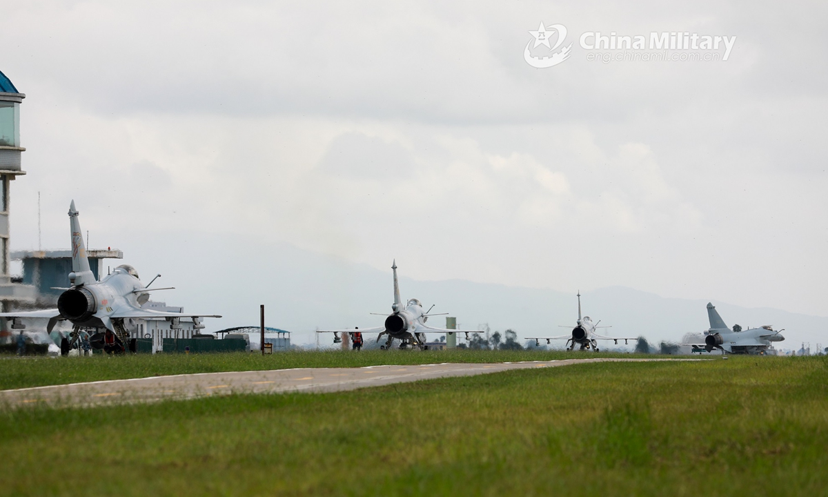 Fighter jets attached to an aviation brigade of the air force under the PLA Southern Theater Command taxi in close formation on the runway during a flight mission in early August, 2020. (eng.chinamil.com.cn/Photo by Wang Guoyun)