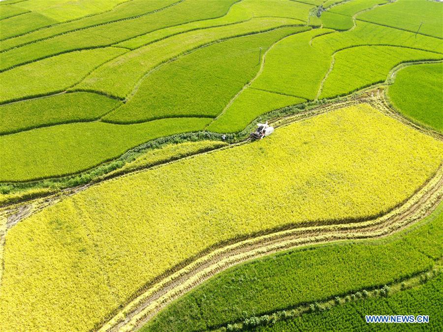 Aerial photo taken on Aug. 24, 2020 shows a reaper working in a paddy field in Huashan Village of Shuangfeng County, Loudi City, central China's Hunan Province. Paddy fields in Shuangfeng County have entered harvest season recently. (Photo by Li Jianxin/Xinhua)