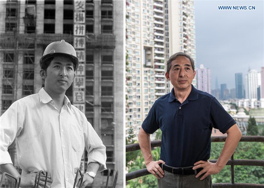 Combo photo shows 28-year-old Luo Jundong, one of designers of Shenzhen International Trade Centre Building, posing at the construction site in 1984 (L, photo taken by Liu Yusheng) and Luo posing at his home on Dec. 5, 2018 (R, photo taken by Mao Siqian) in Shenzhen, south China's Guangdong Province. Luo followed the construction company from Hubei Province to Shenzhen to build the International Trade Centre Building in 1982. Luo and his team provided new techniques for the construction and set a record of erecting one story in three days. After the project finished, Luo stayed in Shenzhen. When China established the Shenzhen Special Economic Zone in 1980, its population was less than 30,000. Forty years later, it has developed into the biggest immigrant city in China housing 13 million with its GDP hitting 2.69 trillion yuan (about 389.4 billion U.S. dollars). (Xinhua)