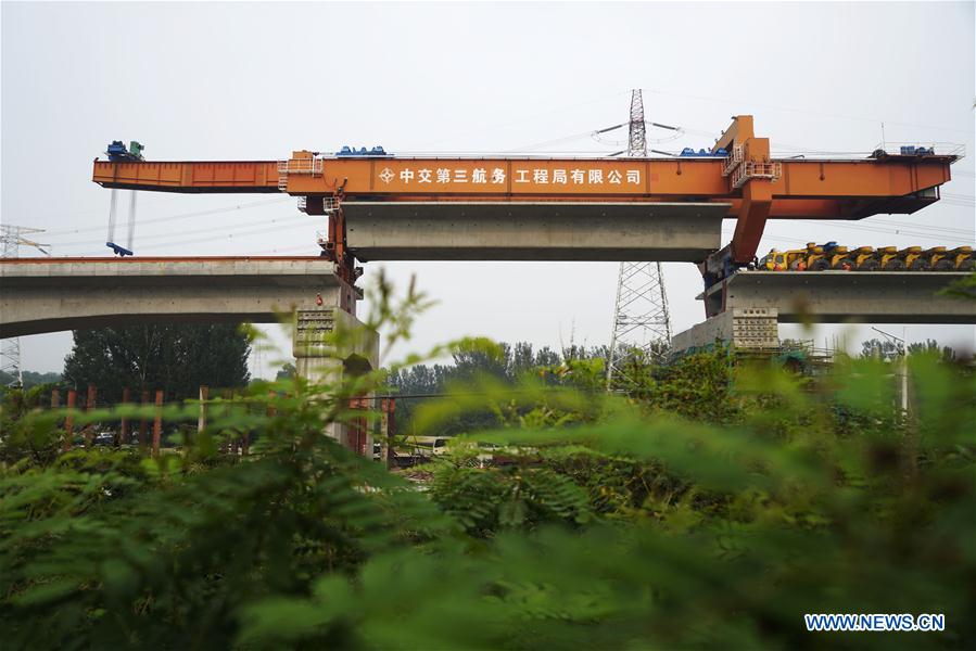 The last box girder of Wenyu River grand bridge is installed for Beijing-Shenyang high-speed railway in Beijing, capital of China, Aug. 26, 2020. Box girders have all been placed in position for sections of Beijing-Shenyang high-speed railway that have not started operation yet. (Xinhua/Xing Guangli)