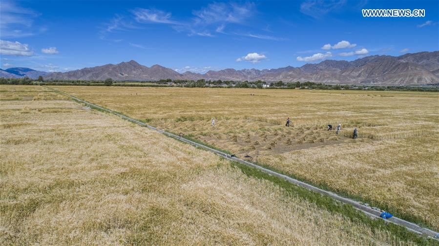 Aerial photo taken on Aug. 29, 2020 shows farmers harvesting highland barley in Gyangze County of Xigaze, southwest China's Tibet Autonomous Region. Local farmers are now busy in the fields in the harvest season of highland barley. (Xinhua/Sun Fei)