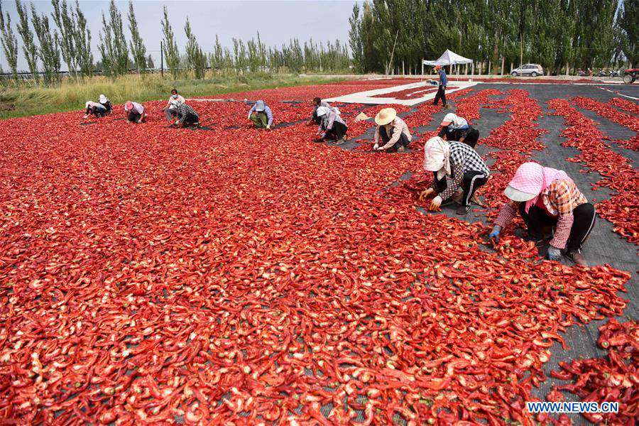 Farmers air chilies at Dongdahan Village of Bohu County in Mongolian Autonomous Prefecture of Bayingolin, northwest China's Xinjiang Uygur Autonomous Region, Sept. 1, 2020. More than 500,000 mu (about 33,333 hectares) of chilies in Bayingolin are now entering harvest season. In recent years, local authorities have encouraged local farmers to plant high-quality and high-yield chili varieties based on market needs, as a way to help improve their incomes. (Xinhua/Ding Lei)