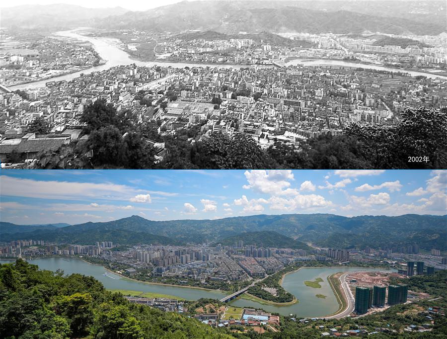 Combination photo shows Kaizhou District, southwest China's Chongqing Municipality in 2002 (top, file photo provided by Chongqing Three Gorges Migrants Memorial) and on Aug. 4, 2020 (bottom, photo taken by Huang Wei), respectively. This year, people living in regions of the Three Gorges Project, the world's largest hydropower project, witnessed a historic achievement in bidding farewell to poverty. Covering about 10,000 square km, the regions involved in the project are located in the upper reaches of the Yangtze River, China's longest waterway. With a population of about 30 million, they had been plagued by poverty long before the project was launched. All of the 19 local districts and counties shook off poverty in May thanks to a series of supportive policies and local government efforts. Here's a collection of images which offer an alternative perspective on the changes in some of the Three Gorges Project regions before and after the reservoir water storage. (Xinhua)