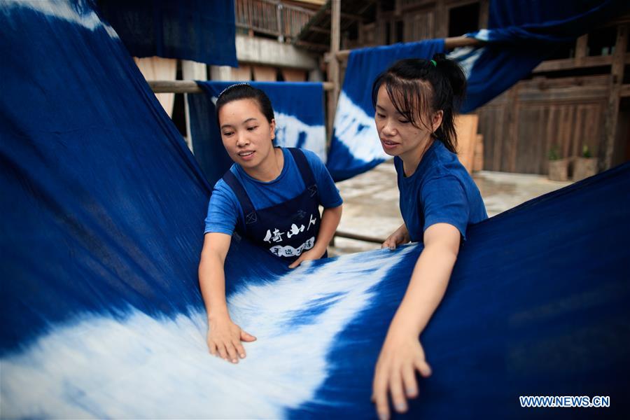 Two women smooth a piece of cloth at a workshop in Fengdeng Dong Village of Rongjiang County, southwest China's Guizhou Province, Sept. 6, 2020. Locals take advantage of the favorable autumn weather conditions to make the traditional cloth of Dong ethnic group. (Xinhua/Liu Xu)