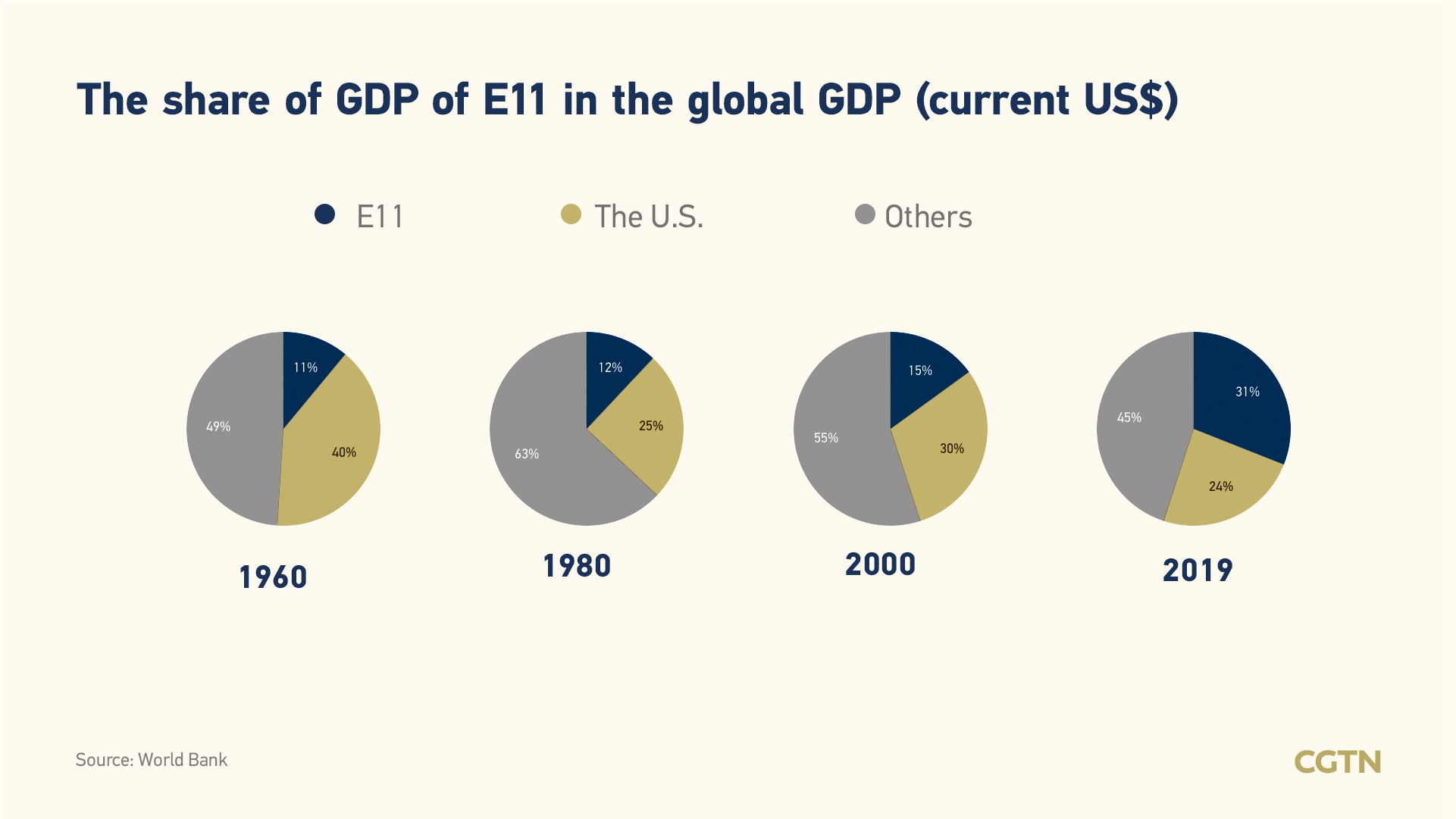 Since the 21st century, emerging economies like China have developed rapidly, playing a more and more vital role in the world economy. According to data from the World Bank, calculated at the current U.S. dollar exchange rate, the share of the major emerging economies, defined as "E11", (including the economies of Argentina, Brazil, China, India, Indonesia, the Republic of Korea, Mexico, Russia, Saudi Arabia, South Africa and Turkey) in global GDP has increased from 11 percent in 1960 to 31 percent in 2019, clearly exceeding the share of the United States.