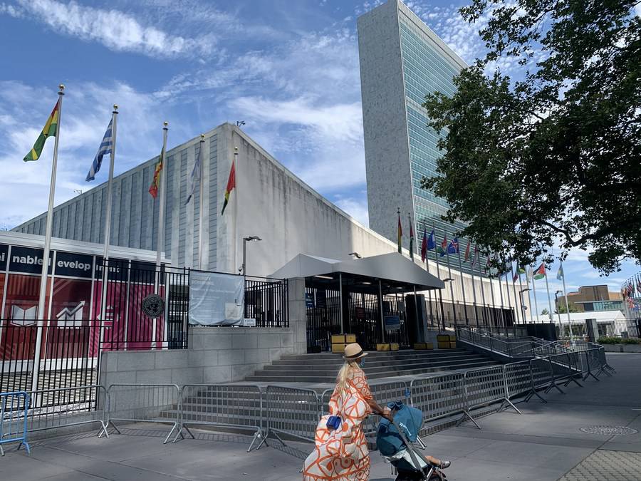 A woman walks with a baby stroller in front of the United Nations (UN) headquarters in New York, the United States, July 20, 2020. (Xinhua/Wang Jiangang)