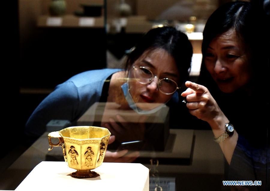 People watch an exhibit during the exhibition of Baoli Era: Treasures From the Tang Shipwreck Collection in east China's Shanghai, Sept. 14, 2020. A total of 248 pieces (group) of cultural relics are displayed during the exhibition, which will run until Jan. 10, 2021. (Xinhua/Ren Long)