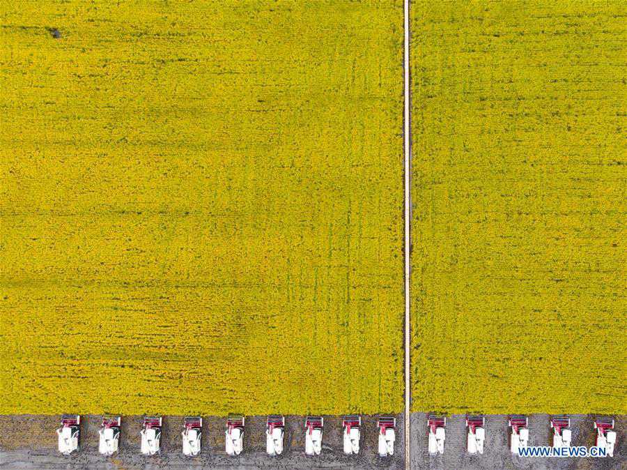 Aerial photo taken on Sept. 21, 2020 shows the paddy rice to be harvested at a paddy rice park in Fujin City, northeast China's Heilongjiang Province. In recent days, about 40,000 Mu (about 2,667 hectares) paddy fields here have entered harvest season. (Xinhua/Zhang Tao)