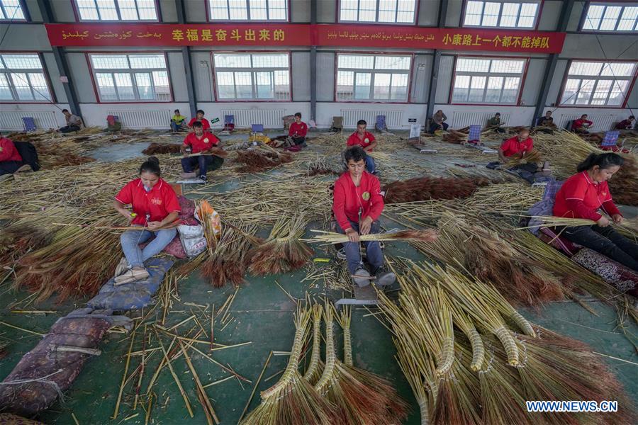 Local villagers make brooms at a specialized cooperative at a village in Tokkuzak Township, Shufu County, northwest China's Xinjiang Uygur Autonomous Region, Sept. 21, 2020. Taking advantages of geographical conditions, villages in Tokkuzak Township developed a series of businesses as broom making, fruit and flower planting as the local economy structure is adjusted to better help boost incomes. (Xinhua/Zhao Ge)