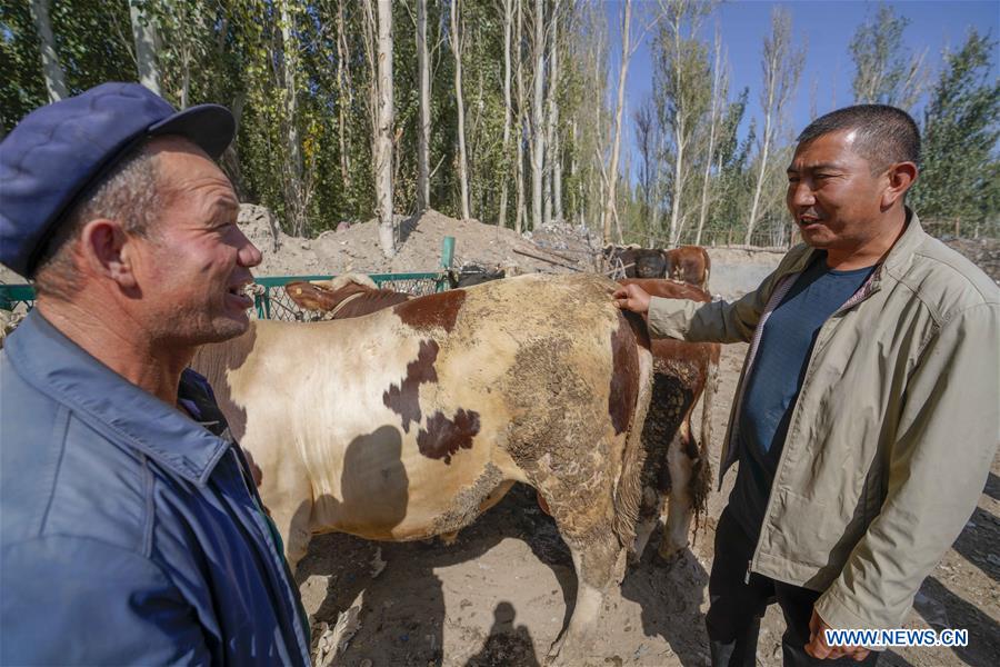 A local villager buys cows at a rural bazaar in Tokkuzak Township, Shufu County, northwest China's Xinjiang Uygur Autonomous Region, Sept. 21, 2020. Taking advantages of geographical conditions, villages in Tokkuzak Township developed a series of businesses as broom making, fruit and flower planting as the local economy structure is adjusted to better help boost incomes. (Xinhua/Zhao Ge)