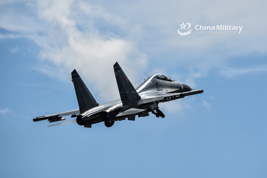 A fighter jet attached to an aviation brigade of the air force under the PLA Eastern Theater Command soars into the sky during a round-the-clock flight training exercise on September 17, 2020. Airmen with the aviation brigade fully studied the changes in weather, bird activity, equipment performance and other aspects brought about by seasonal changes, so as to practice the basic skills of aerial combat to the best. (eng.chinamil.com.cn/Photo by Fu Gan)