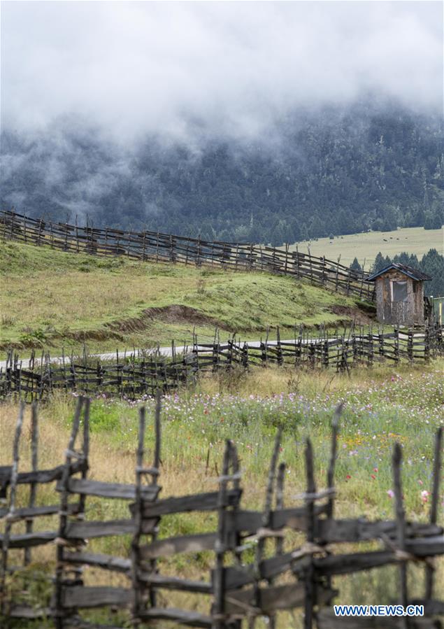 Photo taken on Sept. 11, 2020 shows a highland pasture in Lunang Township of Nyingchi, southwest China's Tibet Autonomous Region. At over 3,300 meters above sea level, Lunang Township is a well-known tourist destination along the Sichuan-Tibet expressway. (Xinhua/Sun Fei)