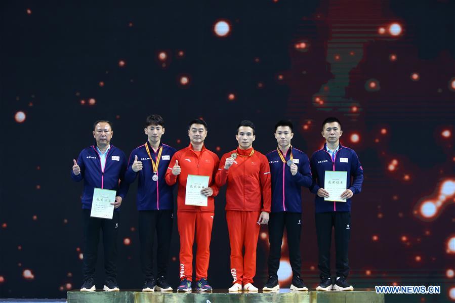 First-placed Deng Shudi (3rd R), second-placed Wang Haoran (2nd L) of Shandong and third-placed Zhou Caisong (2nd R) of Shangdong pose for photos at the awarding ceremony of the men's floor exercises final at the 2020 Chinese National Artistic Gymnastics Championships in Zhaoqing, south China's Guangdong Province, Sept. 27, 2020. (Xinhua/Xu Ya'nan)