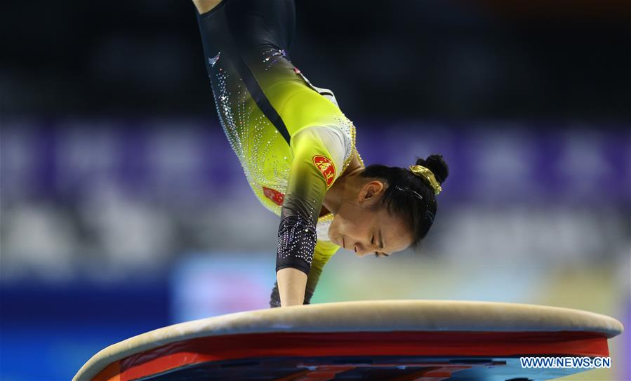 Yu Linmin of team Fujian competes during the women's vault final at the 2020 Chinese National Artistic Gymnastics Championships in Zhaoqing, south China's Guangdong Province, Sept. 27, 2020. (Xinhua/Xu Ya'nan)