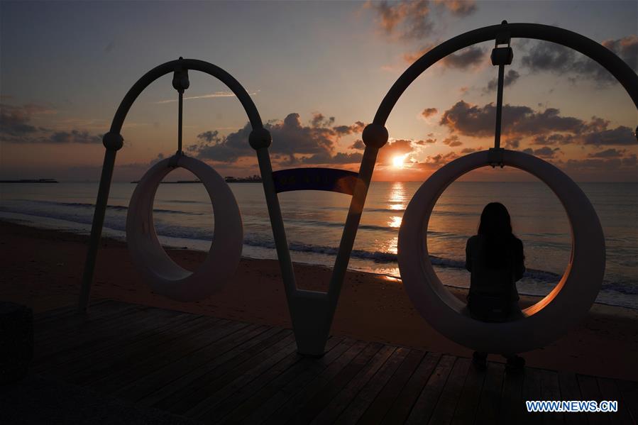 A tourist is seen at the seaside of Rizhao City, east China's Shandong Province, Sept. 28, 2020. China is set to welcome eight days of national holiday this year as the Mid-Autumn Festival coincide with the country's National Day. (Xinhua/Fan Changguo)