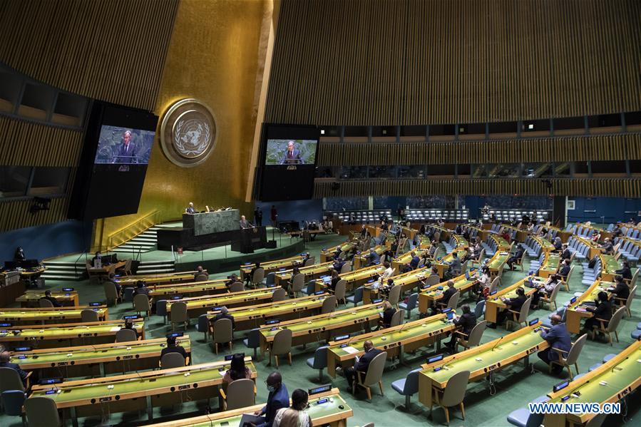 United Nations Secretary-General Antonio Guterres addresses a high-level meeting on the 25th Anniversary of the Fourth World Conference on Women at the United Nations headquarters in New York, on Oct. 1, 2020. Guterres on Thursday urged member states to make concrete, time-bound and ambitious commitments to women's leadership and full participation. (Eskinder Debebe/UN Photo/Handout via Xinhua)