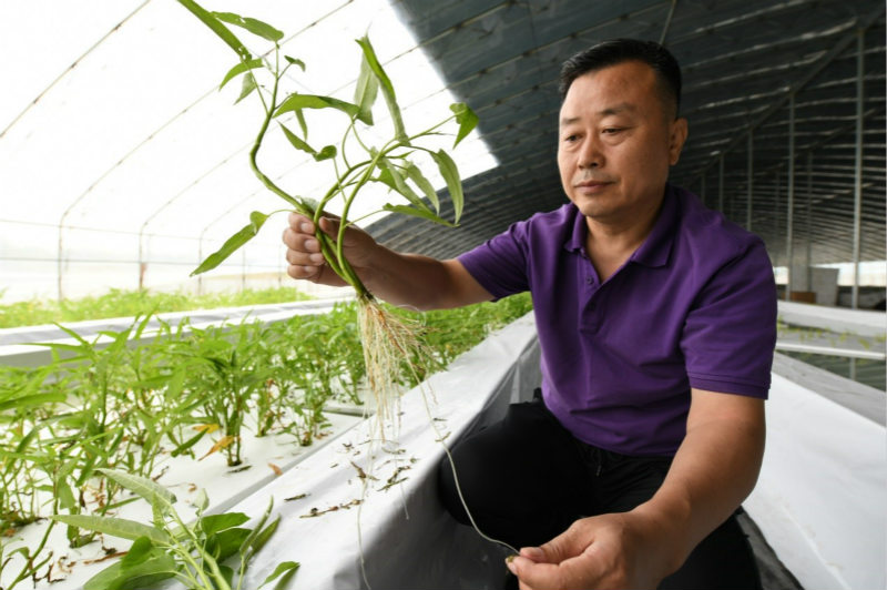 A man checks the growth of water spinach in a fish-vegetable greenhouse in Jin’an village, Guangping county, Handan, north China’s Hebei province, Sept. 13. Photo by Cheng Xuehu, People’s Daily Online