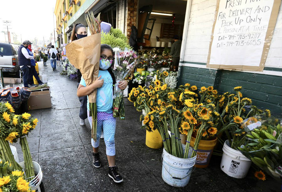 People shop at a flower market in downtown Los Angeles, the United States, May 8, 2020. (Xinhua)