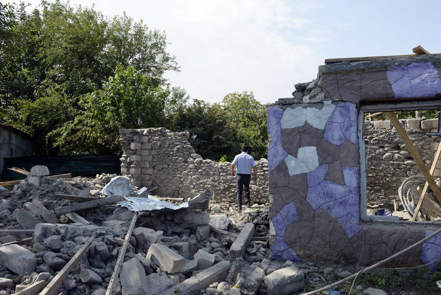 Photo taken on Sept. 29, 2020 shows a house damaged in the clashes between Armenian and Azerbaijani forces in the Tartar district bordering the Nagorno-Karabakh region. (Photo by Tofik Babayev/Xinhua)