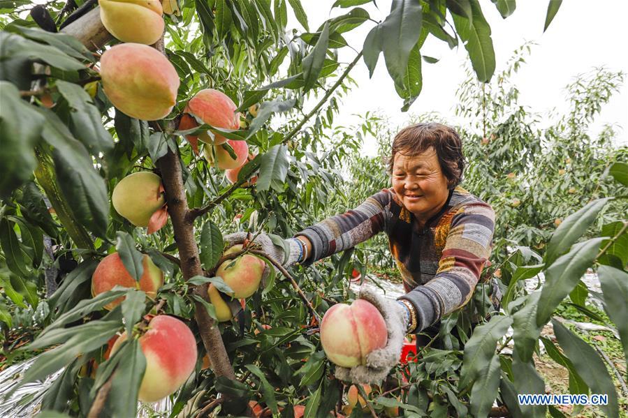 A villager picks peaches at an orchard in Xingwangzhai Township of Zunhua, Tangshan City, north China's Hebei Province, Oct. 11, 2020. (Photo by Liu Mancang/Xinhua)
