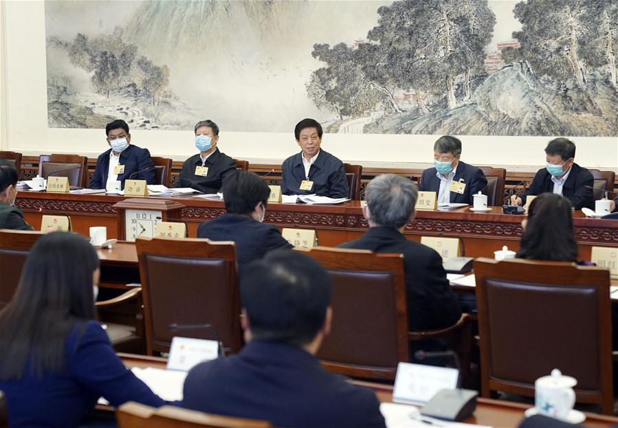 Li Zhanshu, chairman of the National People's Congress (NPC) Standing Committee, joins lawmakers in group discussions during the ongoing session of the NPC Standing Committee in Beijing, capital of China, Oct. 14, 2020. Chinese lawmakers Wednesday held the discussions to review bills including draft amendments to the National Flag Law and the National Emblem Law and a draft Yangtze River conservation law. Lawmakers also discussed a draft amendment to the Electoral Law of the NPC and local people's congresses. (Xinhua/Liu Weibing)