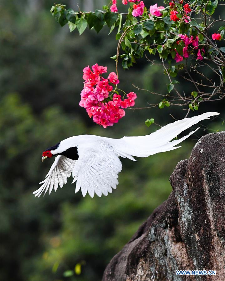 A silver pheasant makes a leap at the Exiandong nature reserve in Nanjing County, southeast China's Fujian Province, Oct. 14, 2020. (Xinhua/Peng Zhangqing)