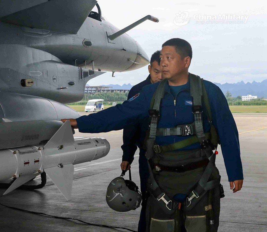 A pilot assigned to an aviation brigade of the air force under the PLA Southern Theater Command receives his fighter jet from a maintenance personnel in a military airfield prior to a ferry flight training exercise on October 16, 2020. (eng.chinamil.com.cn/Photo by Gu Haodong)