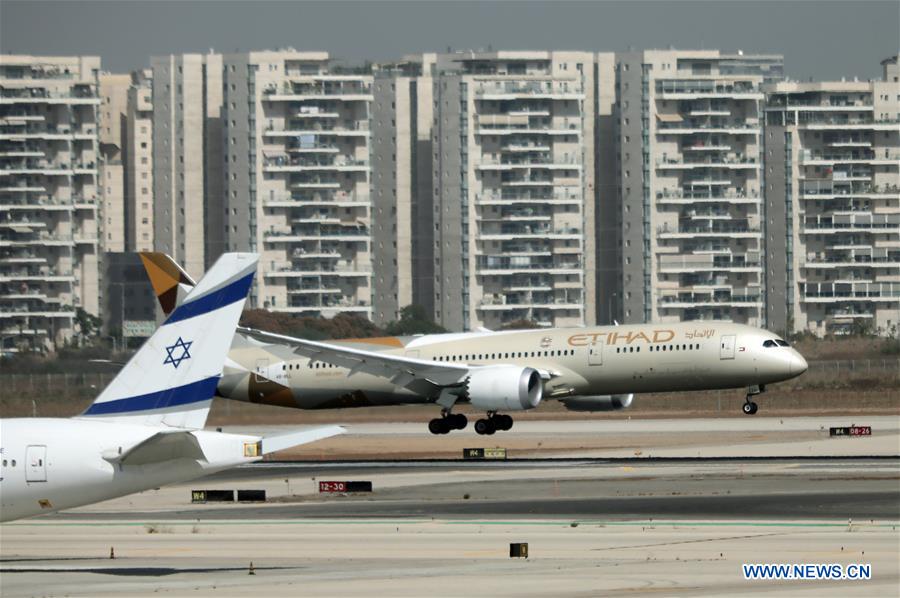 An airplane carrying the first official delegation from the United Arab Emirates (UAE) lands at the Ben Gurion international airport outside Tel Aviv, Israel, on Oct. 20, 2020. The first official delegation from the United Arab Emirates (UAE) landed in Israel on Tuesday and signed four bilateral agreements, according to a Youtube live broadcast by Israeli prime minister's office. (Gideon Markowicz/JINI via Xinhua)