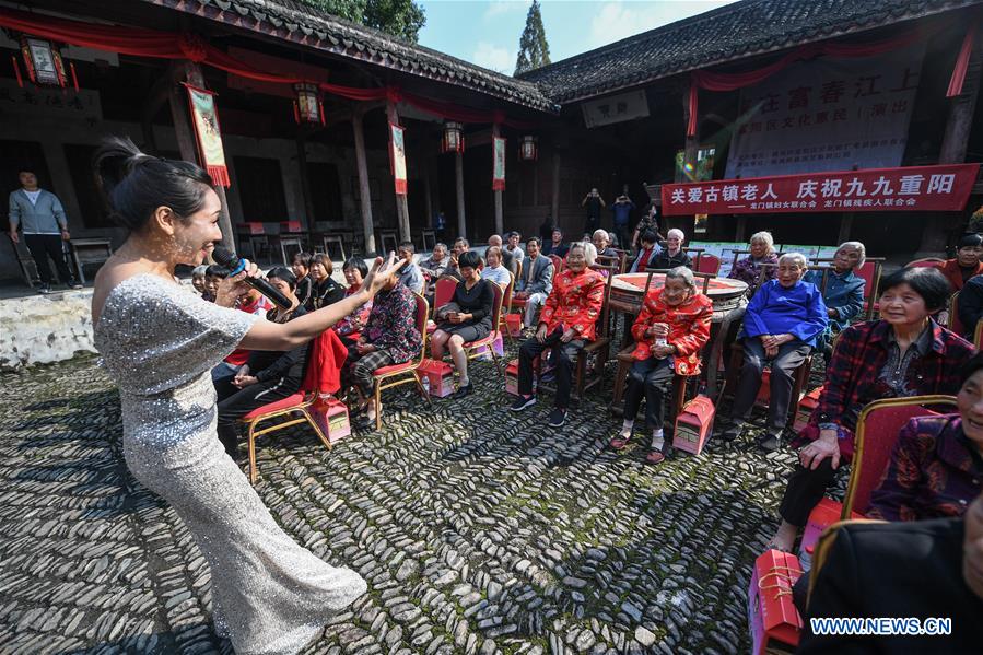 Senior residents watch a performance in Longmen ancient town of Fuyang in Hangzhou, east China's Zhejiang Province, Oct. 20, 2020. An event to greet the upcoming Double Ninth Festival, also known as Chongyang Festival, was held in the ancient town on Tuesday. (Xinhua/Xu Yu)
