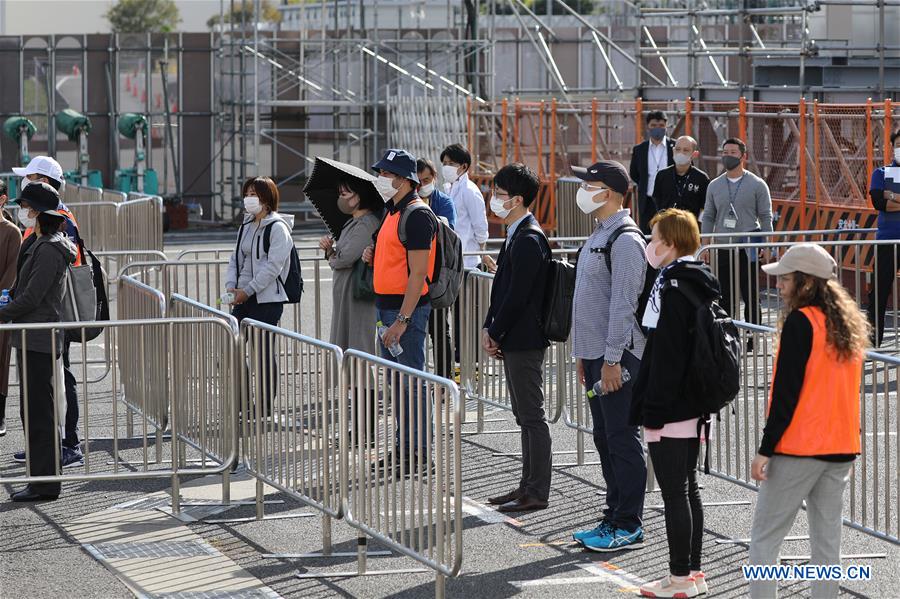 People acting the roles of spectators wait in line with social distantce outside the pedestrian screening areas during the screening demonstration test at Tokyo Big Sight in Tokyo, Japan, Oct. 21, 2020. Tokyo Organising Committee of the Olympic and Paralympic Games held a test of spectator and Games official screening measures on Wednesday, testing a number of different measures, including COVID-19 countermeasures, currently under consideration for deployment at pedestrian screening areas for spectators and Games officials during the Games. (Xinhua/Du Xiaoyi)