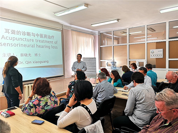 Dr Qin Xiaoguang from Gansu University of Chinese Medicine gives a lecture on TCM treatment in Ukraine.