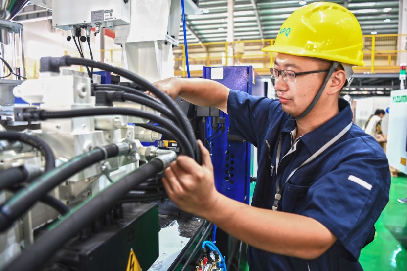 Photo taken on September 22 shows a worker producing components and parts for laptops, appliances, high-speed train seats and cars at a plant in Qutang township, Hai'an, East China's Jiangsu Province. (People's Daily Online/Jiang Ming)