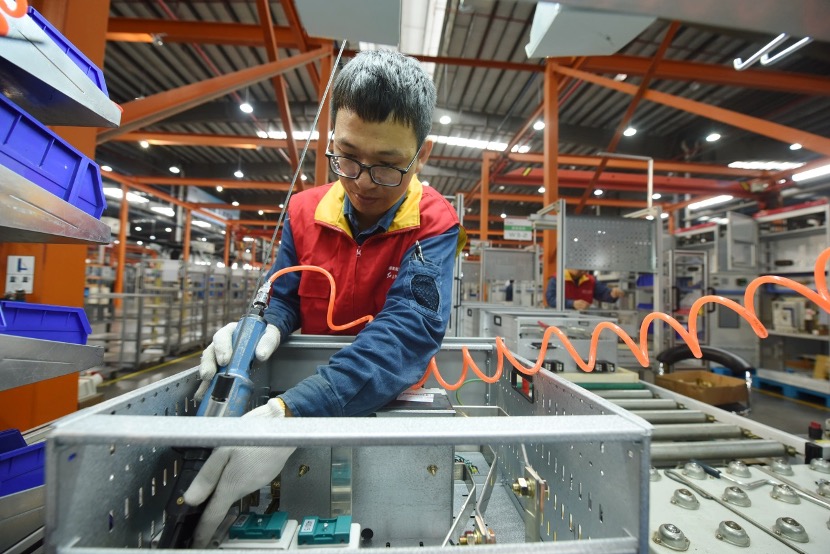 A worker assembles a smart power distribution cabinet at the State Grid Xiaoshan Electric Power Xinmei Electric Company in Hangzhou, East China's Zhejiang Province on October 19. (People's Daily Online/Long Wei)