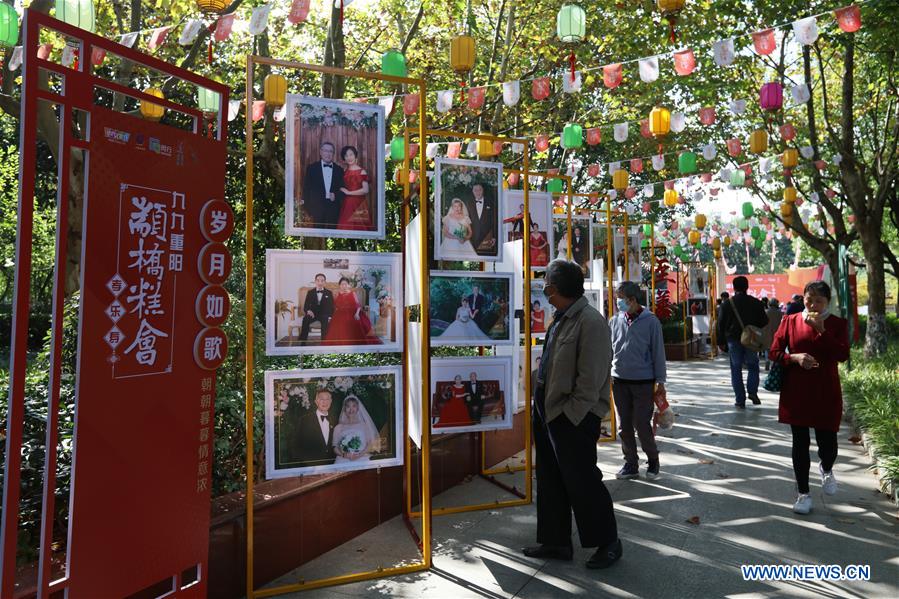 People watch photos of couples at their golden wedding anniversary at a park in Shanghai, east China, Oct. 25, 2020. A series of activities celebrating the Double Ninth Festival or the Chongyang Festival, were held here on Sunday. (Xinhua/Wang Xiang)