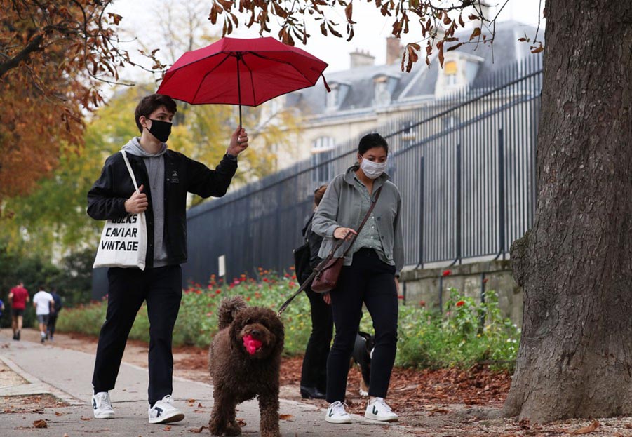 People wearing face masks walk their dogs at the Luxembourg park in Paris, France, Oct. 23, 2020. (Xinhua/Gao Jing)
