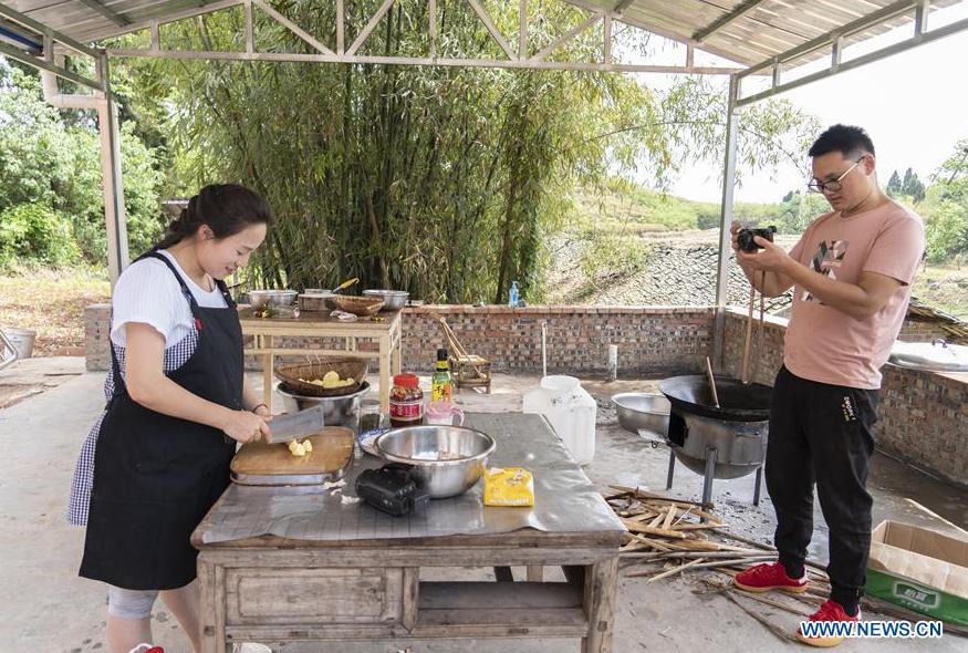 Zhou Xiaolong shoots a video for his wife Xu Yan in Baihua Town, Yibin City of southwest China's Sichuan Province, April 27, 2020. Zhou Xiaolong and his wife Xu Yan, who used to work in different cities, now live in the countryside and run a live streaming account with more than 3 million followers. (Photo/Xinhua)