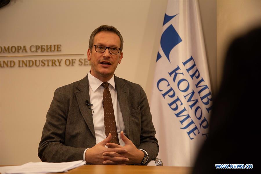 Mihailo Vesovic, director of the Division for Strategic Analyses, Services and Internationalization at the Serbian Chamber of Commerce and Industry (PKS), is interviewed with Xinhua in Belgrade, Serbia, on Oct. 22, 2020. In spite of the challenges posed by the COVID-19 pandemic, Serbia looks forward to presenting its products at the upcoming China International Import Expo (CIIE) in Shanghai with the aim of expanding its exports, Mihailo Vesovic told Xinhua in a recent interview. (Xinhua/Shi Zhongyu)